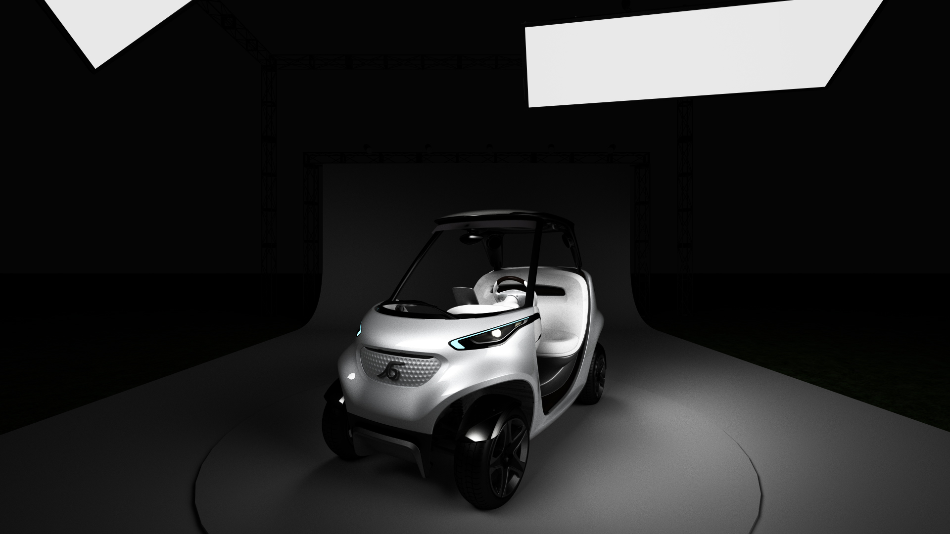 When putting on the googles, the application starts with in a black space. A car appears from far and drives into a virtual photo studio that turns on the lights just for a second in order to briefly reveal the new design. Seconds later the car dissapears again into the black space.